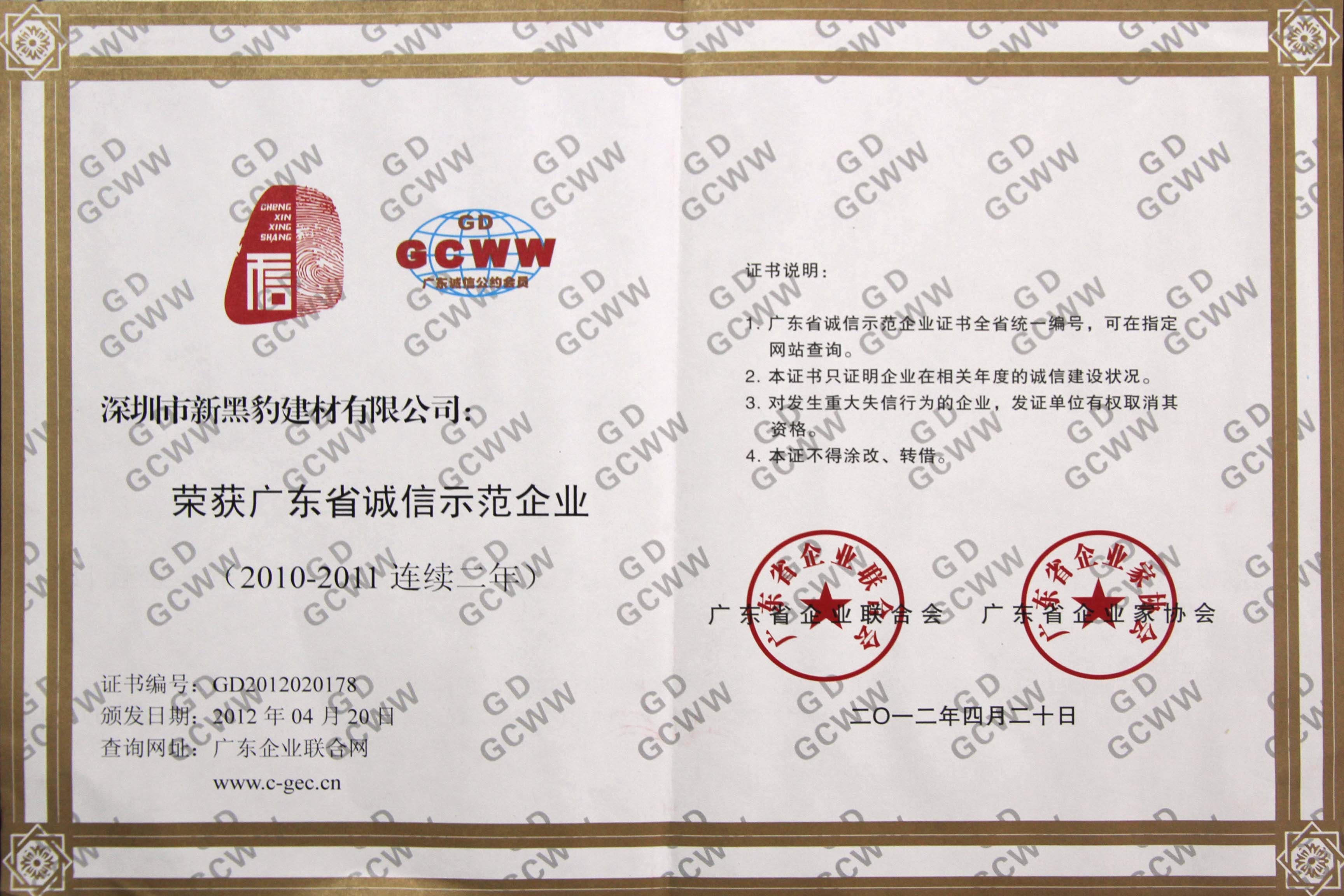 深圳市新黑豹建材有限公司獲得“2011年度廣東省誠信示范企業(yè)”榮譽稱號