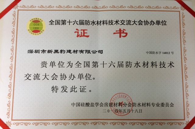 我公司協(xié)辦全國第十六屆防水材料技術(shù)交流大會證書