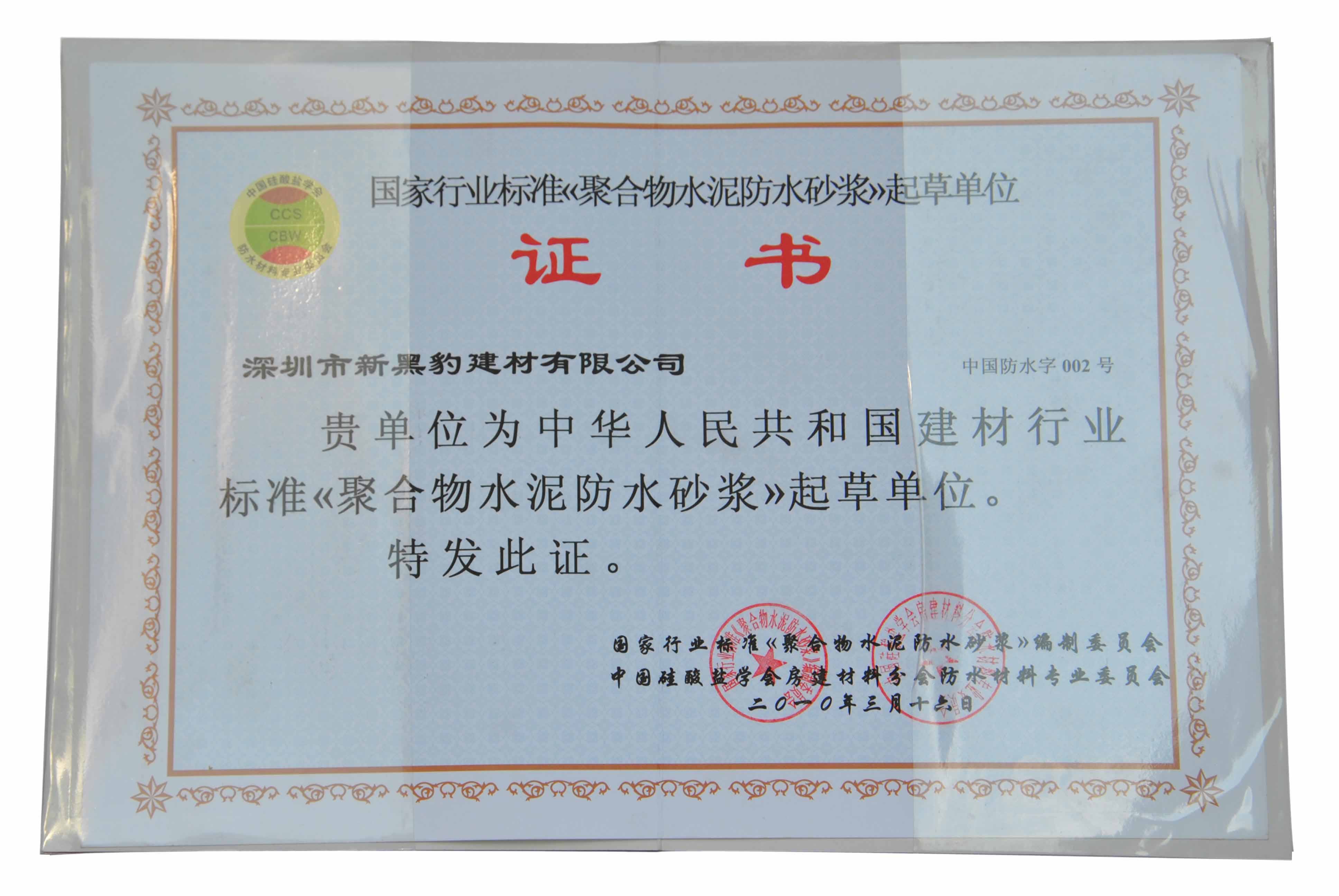2010年,深圳市新黑豹建材有限公司為中華人民共和國(guó)國(guó)際標(biāo)準(zhǔn)《聚合物水泥防水砂漿》起草單位之一,國(guó)家行業(yè)標(biāo)準(zhǔn)《聚合物水泥防水砂漿》編制委員會(huì)特發(fā)此證。