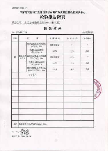 為了給客戶提供更好的產(chǎn)品,我公司現(xiàn)已對(duì)水泥基滲透結(jié)晶型防水材料的配方進(jìn)行了升級(jí),并委托國(guó)家建筑材料工業(yè)建筑防水材料產(chǎn)品質(zhì)量監(jiān)督檢驗(yàn)測(cè)試中心對(duì)該產(chǎn)品按照國(guó)家強(qiáng)制標(biāo)準(zhǔn)GB18445-2012進(jìn)行了型式檢驗(yàn)(即按國(guó)家標(biāo)準(zhǔn)所有指標(biāo)項(xiàng)目檢驗(yàn))。我公司升級(jí)后的水泥基滲透結(jié)晶型防水材料通過國(guó)家建筑材料工業(yè)建筑防水材料產(chǎn)品質(zhì)量監(jiān)督檢驗(yàn)測(cè)試中心型式檢驗(yàn)后,完全能達(dá)到國(guó)家標(biāo)準(zhǔn)。