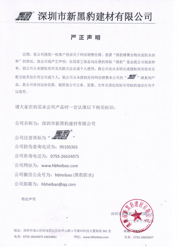 公司防偽查詢電話為:95105365 公司咨詢電話為:0755-26634075 公司網(wǎng)站為:www.tefsa.com.cn 公司微信公眾號(hào)為:hbheibao (黑豹防水) 公司郵箱為:hbheibao@qq.com 特此聲明 深圳市新黑豹建材有限公司 二0一九年十月八日
