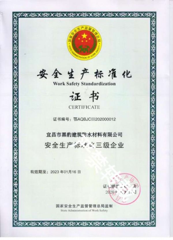 正當(dāng)人們手捧豐收碩果送走了2019年;正當(dāng)人們滿懷豪情闊步邁進(jìn)2020年;正當(dāng)人們在黨中央英明領(lǐng)導(dǎo)下,團(tuán)結(jié)一心眾志成城戰(zhàn)勝瘟疫,取得了決定性的勝利;正當(dāng)東西南北中各條戰(zhàn)線各族人民信心百倍斗志昂揚(yáng),按照要求分批次有步驟地復(fù)工復(fù)產(chǎn);就在春風(fēng)楊柳萬千條,億萬人民盡舜堯 ,紅雨隨心翻作浪,青山著意化為橋,山花爛漫迎春天的時(shí)節(jié),深圳市新黑豹建材有限公司宜昌生產(chǎn)基地------宜昌市黑豹建筑防水材料有限公司傳來喜訊,企業(yè)安全生產(chǎn)標(biāo)準(zhǔn)化已驗(yàn)收達(dá)標(biāo),并榮獲國家安全生產(chǎn)監(jiān)督管理總局證書。